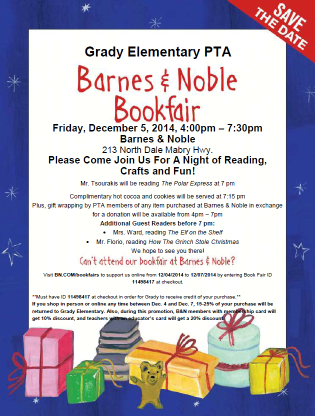 The Grady Barnes & Noble Bookfair will take place on Friday, December 5, 2014 from 4 pm until 7:30 pm. Guest readers will read to kids, and there will a craft table for kids to make a craft. Mrs. Ward will read The Elf on the Shelf; Mr. Florio will read How The Grinch Stole Christmas. Then at 7 pm, Mr. Tsourakis will read The Polar Express. Complimentary hot cocoa and cookies will be served at 7:15 pm