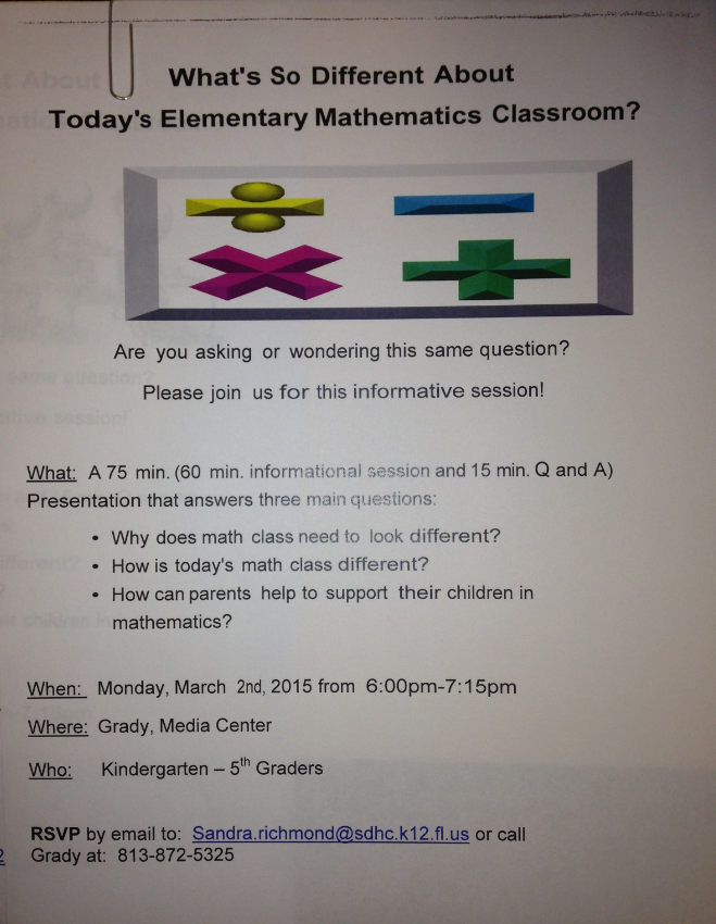 The program will take place Monday, March 2, from 6 pm to 7:15 pm in the Kathryn Hance Media Center. It is an excellent program and a must for parents who want more information about how to help their children thrive while learning mathematics.